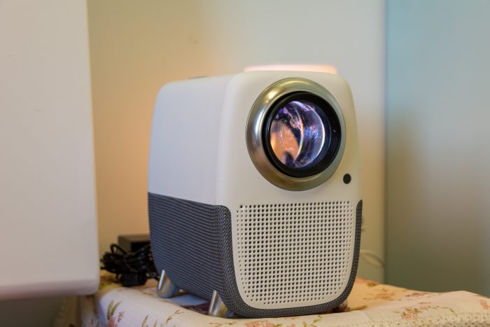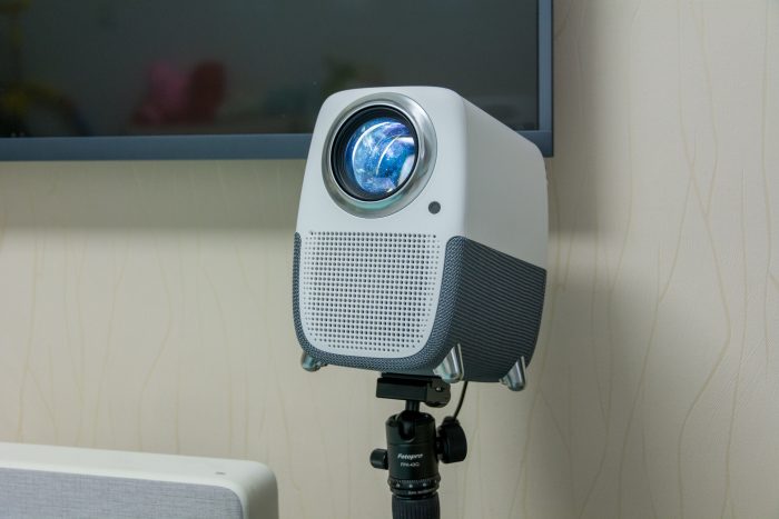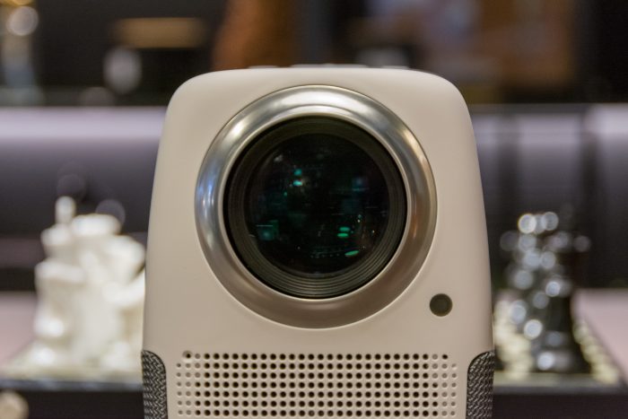 机身正面一个硕大的眼睛,几乎占面板的一半空间。采用了LCD全封闭式光机,相较于市面上那些开放式光机来说,全封闭式光机无论是技术上还是性能上都更具优势,很大程度上提升了投影仪的使用寿命,起到防灰尘、防腐蚀的作用,内部也是全金属光机设计,导热性更快。玻璃镜片表面能看到有镀膜工艺,耐高温的同时,还能呈现高清画质。在下方排列有序的小孔内部,还有循环双涡轮风扇,可以高效的散热。
