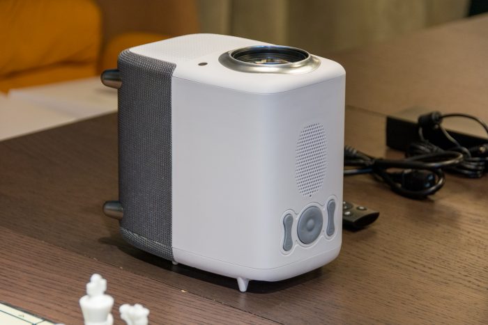 背部上方则提供了几个常用的数据接口,可以USB2.0传输连接、3.5mm耳机连接,AV-IN视频连接、HDMI2.1多媒体连接。下方是DC 12-24V供电口,还可以看到产品的信息等。我还注意到有四个小的白色支撑脚,能投射到棚顶,可以尝试着躺平的观看角度。