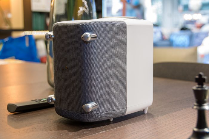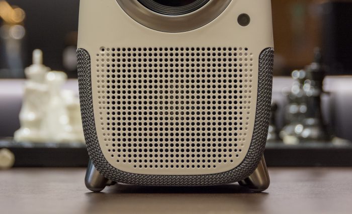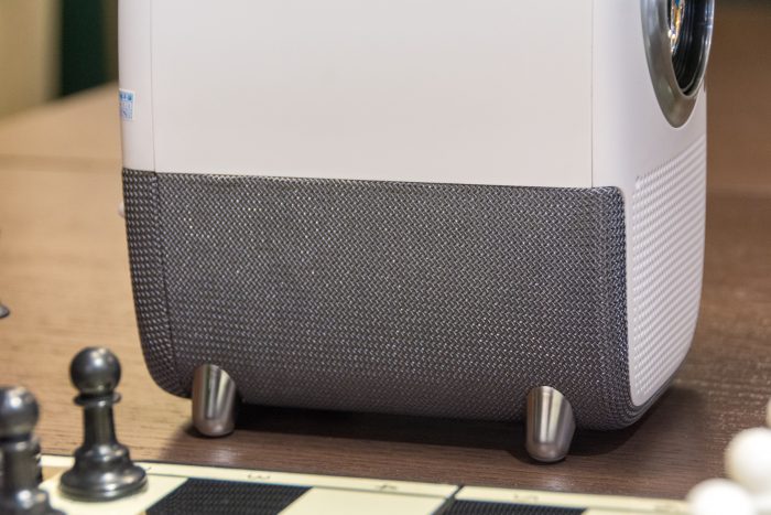 从投影仪的侧面看,是可以分为2部分的,上半部是PVC的白色机身,下半部是网织布的音箱,一直包裹到另一侧,很硬实会比较耐磨。另外,在网布下的不仅起到散热的作用,当选择倒装时,还能起到防尘保护的作用。