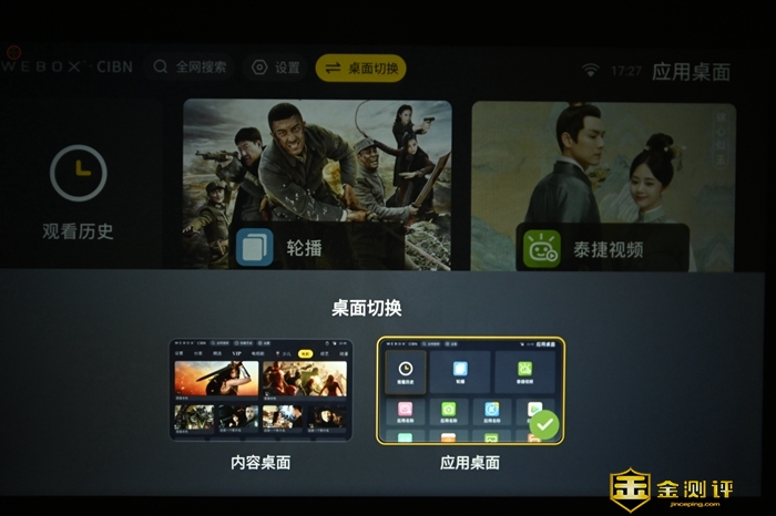WEBOX系统提供了两种桌面,分别是主打视频资源的内容桌面,以及主打第三方应用的应用桌面,两者切换简单快捷,用起来非常方便。在内容桌面中,我们可以找到非常丰富的影音资源,其中既有官方的泰捷视频,也有第三方的银河奇异果、酷喵影视和芒果TV等平台,不需要再去手动安装APP。