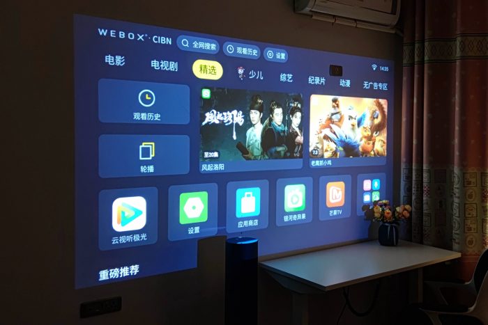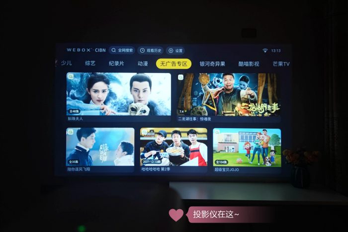 这两张系统界面第一张是午休时拉窗帘拍的,第二张是晚上熄灯后拍的,是不是晚上的效果更好呀。泰捷 WEBOX T1S 投影仪最大的亮点就是内置了 WEBOX 无广告系统,五秒开机,行业内出了名的持久流畅,简单易操作。在 WEBOX 系统里面还拥有无广告专区,在这里观影完全不受广告干扰,追剧体验更好。