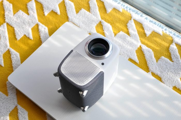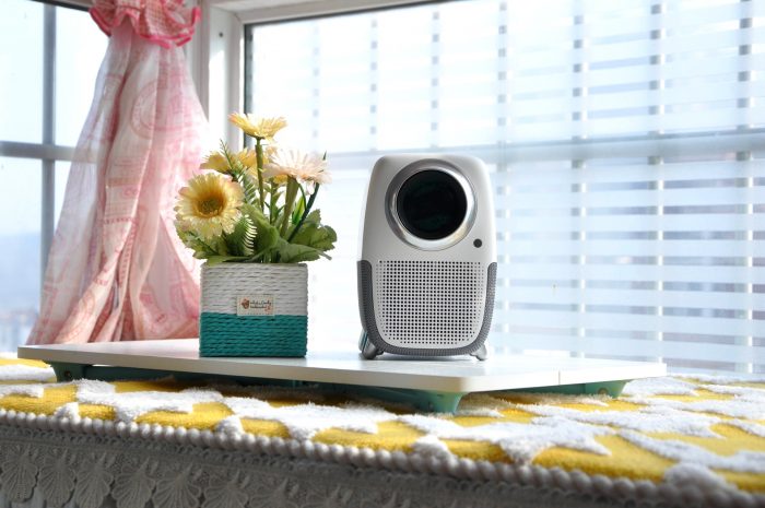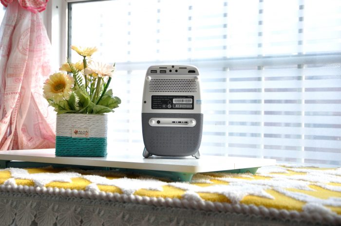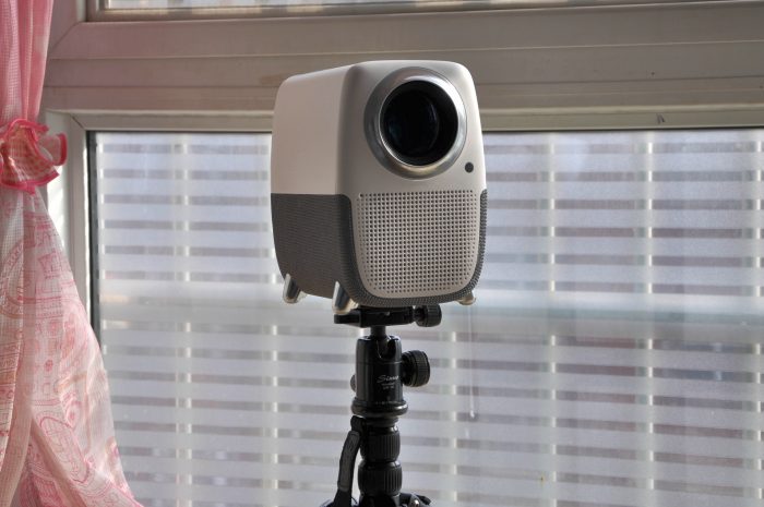 我媳妇比较喜欢向房顶上投影观看,放在床边,让投影仪背部朝下,这时那四颗独有的小支脚就发挥作用了,看电源线可以从缝隙中排出,还不影响音质,多好呀。这样使用小伙伴们是不是在担心时间久了会进灰,其实完全没有必要,因为泰捷 WEBOX T1S 投影仪的设计师们突破了光机的设计瓶颈,采用了全封闭式金属光机,不但防尘防侵蚀,导热还更快,能够增长投影仪的使用寿命。