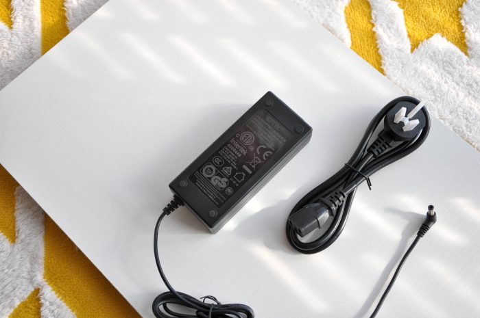 电源适配器的做工够精致吧,电源线和适配器的分离设计还是非常人性化的,如果在老房间内需要吊投,又没有在房顶预留电源,这时候我们就可以购买更长的电源来扩展啦。泰捷 WEBOX T1S 投影仪的 DC 插头采用了弯折设计,这样在向房顶投影时搭配机身后面的四个小支脚,可实现平置于地面,顶投效果更好。