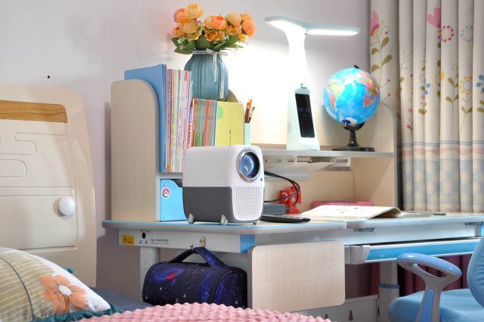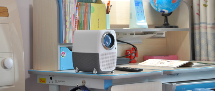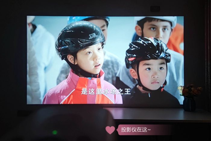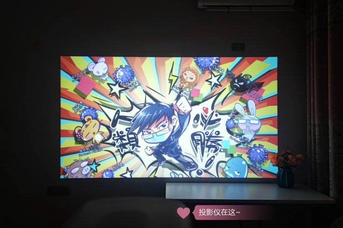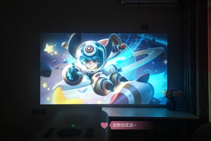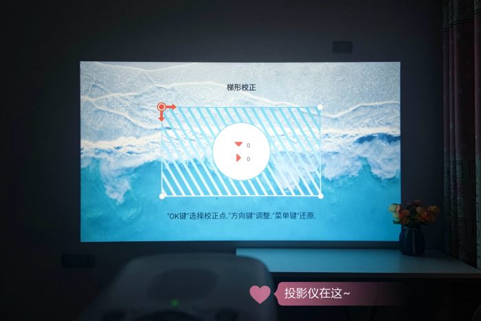 投影仪的好处就是不挑空间,家有大白墙就能用,你可以把它移动到任何地方使用,任意房间或者户外,完全你说了算。这不我又把它放在了儿子的书桌上,书桌在房间的一角,经过梯形校正后也能呈现出正投画面,不过尺寸会缩小,但也不影响观影体验。