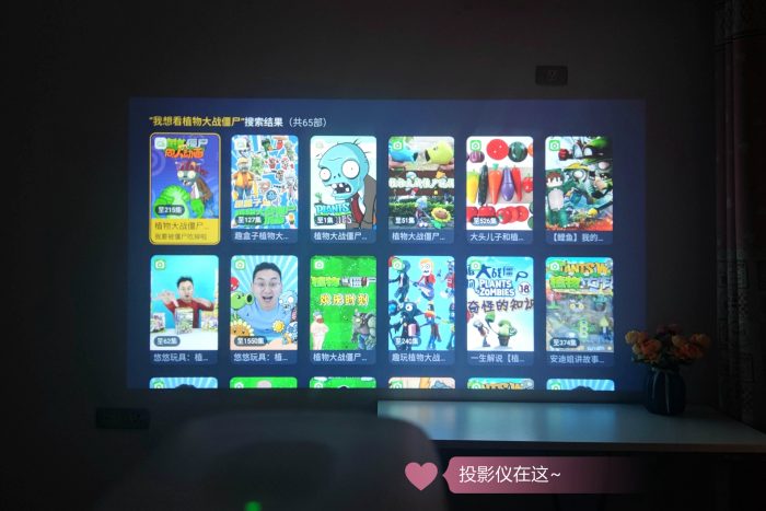 小家伙挺懒呀,拿到 AI 语音遥控器后直接按着说他想看“植物大战僵尸”,这搜索结果还可以吧,语音搜索完成后我们选择观看就好了。就连小孩子都知道用大屏看视频爽,有了投影仪他几乎都不开电视了。