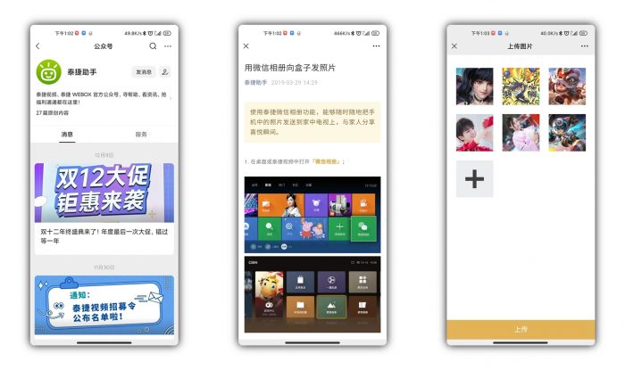 微信相册功能我觉得蛮实用,家庭成员可以把拍的好看的照片上传到投影系统里面,全家共同大屏欣赏。关注“泰捷助手”微信公众号,然后会推送详细的使用教程,我们只需选择相应的照片进行上传就好了,上传成功后在照片的下方会显示上传者昵称和时间,非常直观。