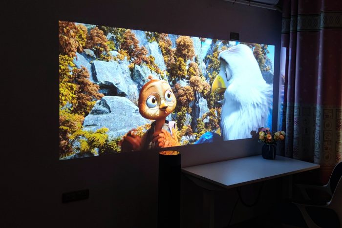 午休的时候我发现了一部新上的动画电影《老鹰抓小鸡》,讲述的是一只失去双亲小鹰的成长史,晚上我决定和小家伙在主卧再一遍,值得推荐哦。泰捷 WEBOX T1S 投影仪拥有 540 ANSI流明亮度,在同价位产品中亮度提升 30%,搭配1080P清晰度播放,效果还是非常不错的,在暗光环境下使用足够了,这几张是午休时拍的,清晰度和画质还可以吧。