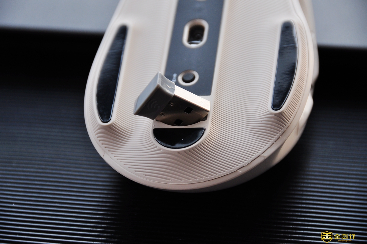 咪鼠智能语音鼠标M5底部为前中后四个脚垫,另外还带有电源开关和蓝牙配对键,还有一个2.4Ghz WIFI接收器的收纳空间,方便随鼠标携带。
