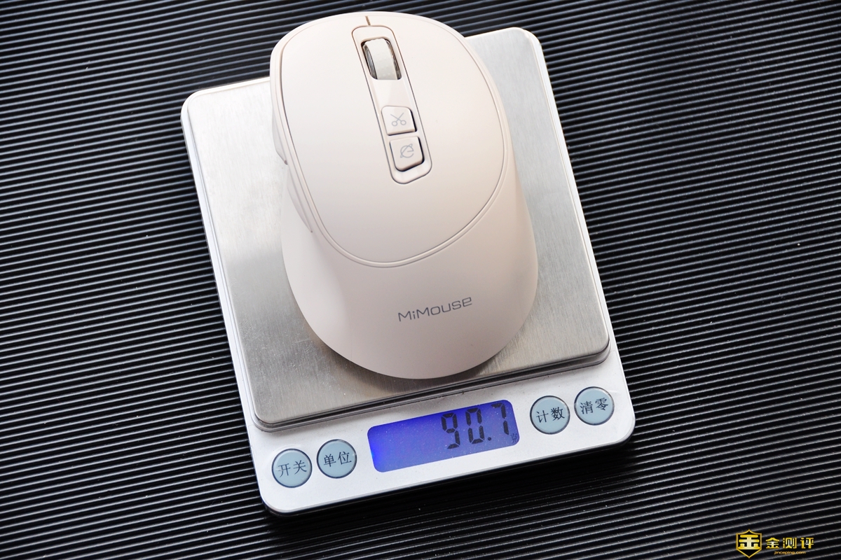 咪鼠智能语音鼠标M5尺寸为108mm*68mm*42mm,官宣重量约为90克,龙哥实测重量约90.7 g(带接收器),与官宣一致。咪鼠智能语音鼠标M5长度短,比普通鼠标至少高1cm,鼠标尾部的高度相当平缓,鼠标整个体积控制很好,小手也能轻松掌控。