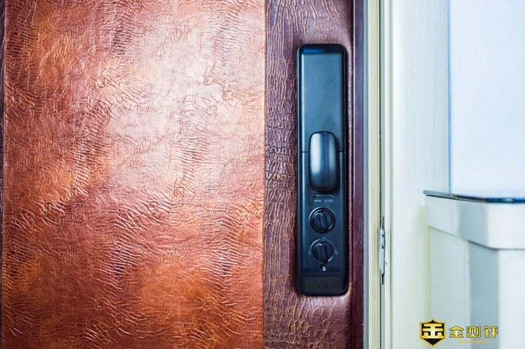关锁关门后,可以手动上锁或者一键布防。其实它的回锁是自动的,回锁时间可以自行设置。它的门把手是垂直向上的,不能被铁丝勾挂,无法通过猫眼来开锁。