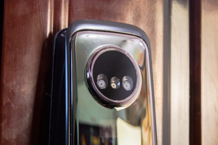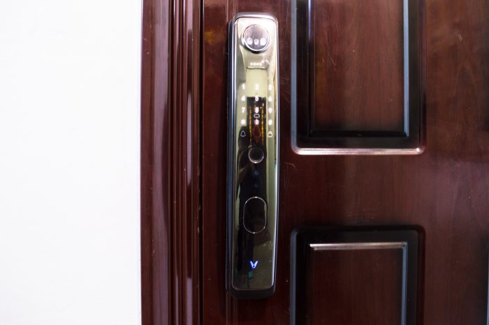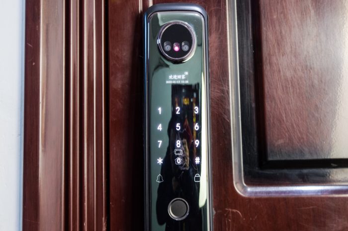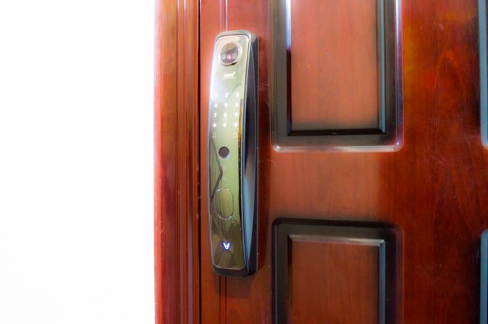 它的外锁很漂亮,是一个弧形的外观,简约大气,整体感很强烈,颇有些科技感,也提升了门的档次。。门锁顶部有醒目的摄像头模块,两只摄像头模能仿人的双眼,能形成立体识别效果,可以辨别照片、视频等图像,用照片是无法开门的。面板中间是指纹识别模块,上方是触控键盘,下方是钥匙孔。在钥匙孔上面,还有一个充电插孔,用于在门锁电量耗尽时,为其提供外部电源,以便正常工作。