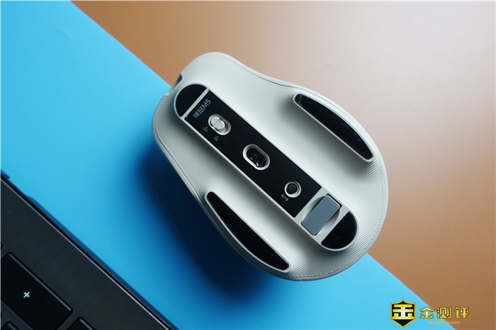 从底部来看,也是非常特别的,左右有两块防滑垫,能够让你在不同的环境下使用,同时底部也有鼠标的开关键,模式切换键,还有就是接收器存放位置。