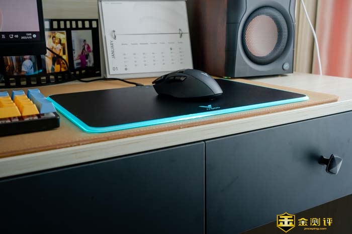 它的尺寸为352*255mm,厚度为6mm。用充电线和电脑的USB接口连接后,鼠标的一圈RGB氛围灯即可亮起来。