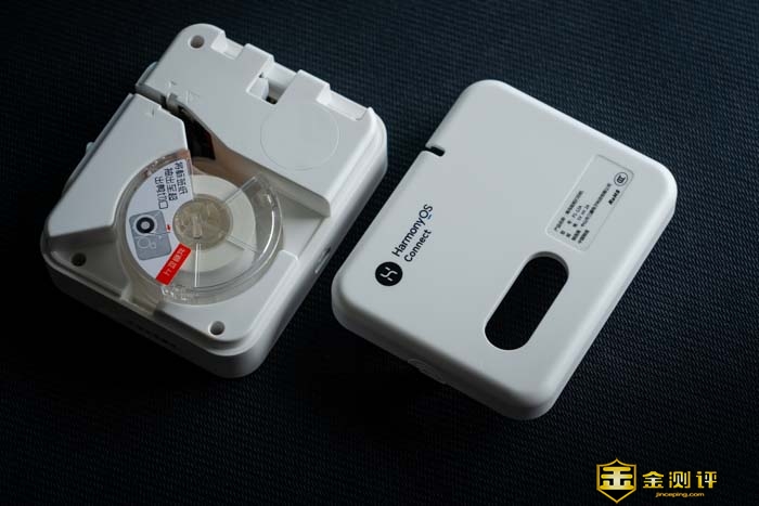 拆开包装后,终于看到打印机的真身了。我这台是白色的,看起来非常的简约,也很时尚。中间还有一个透明的窗口,可以看到里面的贴纸用量。有点像卡带机的复古的感觉。