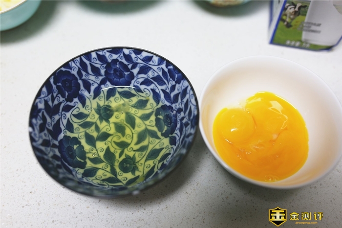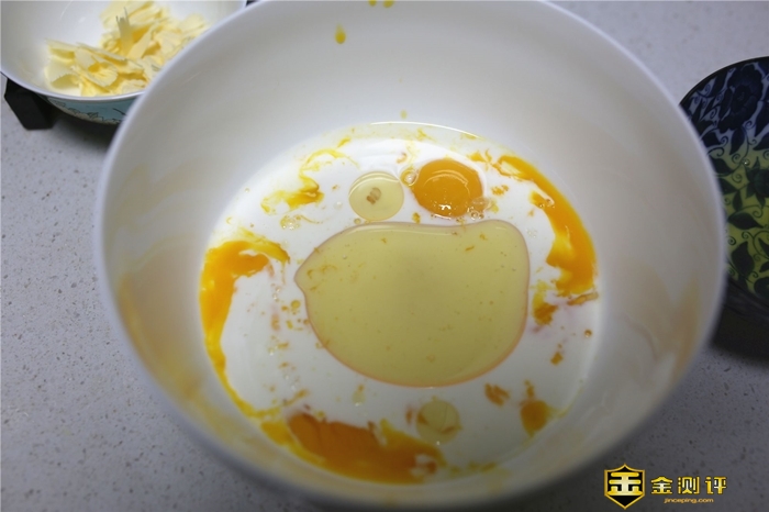 取出蛋黄部分,分别加入牛奶、白糖、橄榄油。