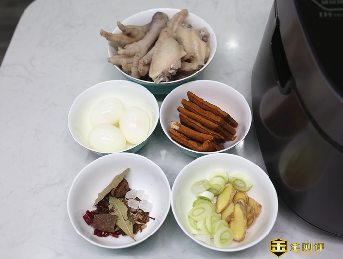 准备材料。包括煮熟的鸡蛋以及切好的香干,焯过水的鸡翅、鸡爪。准备的调料是:生抽、老抽、盐、豆瓣酱、冰糖、八角、香叶等。