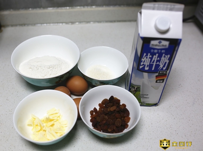 准备材料: 面粉150g 鸡蛋3个 牛奶1杯 葡萄干若干 白糖3勺 橄榄油3勺 黄油一小块