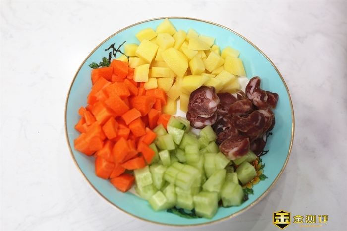 备菜,楼主切好刚从菜市场买的土豆、萝卜、黄瓜以及最爱的腊肠。