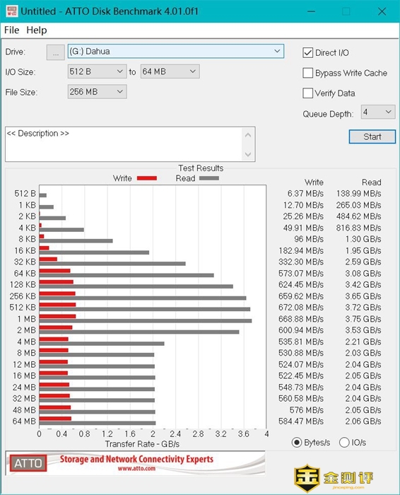 接下来我们用ATTO来进行小文件的读写测试,从结果中可以看到,大华T70整体表现不错,读写速度比较稳定,对小文件的读取性能尤其出色,顺序读取速度能达到500MB/s,顺序写入速度为480MB/s左右,整体表现依然稳定,并且它的散热表现不错,硬盘表面没有过热的问题。