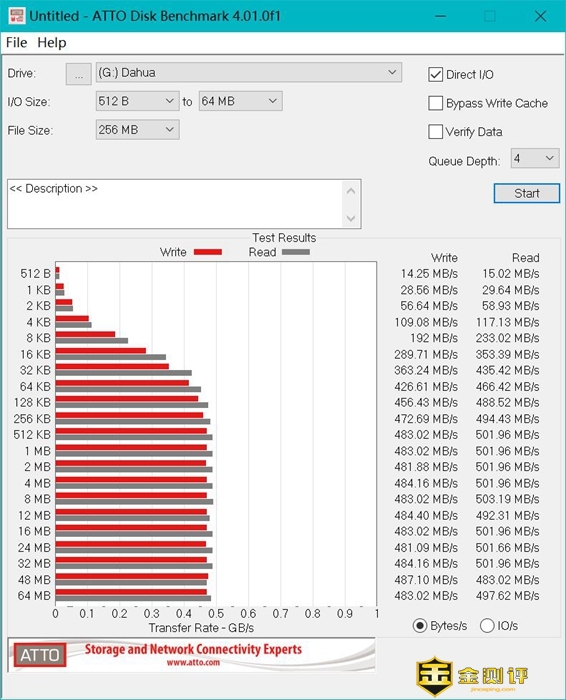接着用ATTO来测试大华T70的读写性能,这款软件分体积对硬盘的读写速度进行测试。从结果可以看到,大华T70的写入速率差不多能达到490MB/s,读取速度达到500MB/,在日常读写一些小文件的时候,速度确实非常稳定,作为系统盘使用也没有问题。