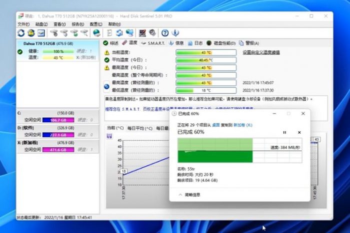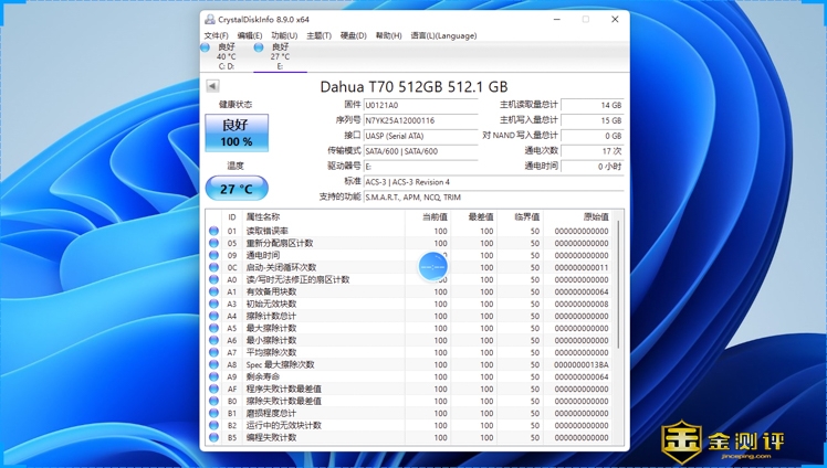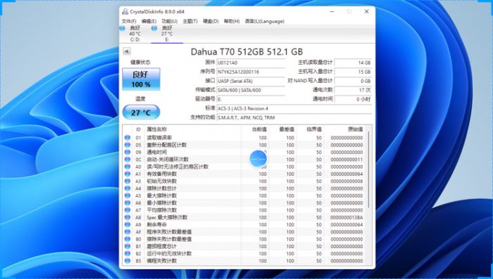 通过CrystalDiskInfo读取,能够准确显示硬盘的名称和容量,硬盘的健康状况良好,温度为27℃,和室温相当。