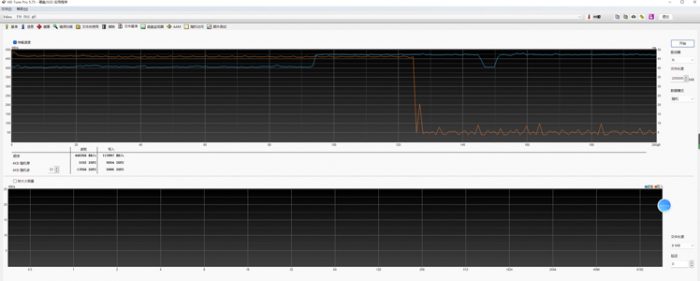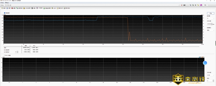 在HDTune文件基准测试当中,显示硬盘的高速缓存为130GB左右,接近于硬盘1/3的容积,在缓存内硬盘始终能够维持高速读写,缓外写入速度会降为50MB/s左右,但读取速度并没有明显下降。