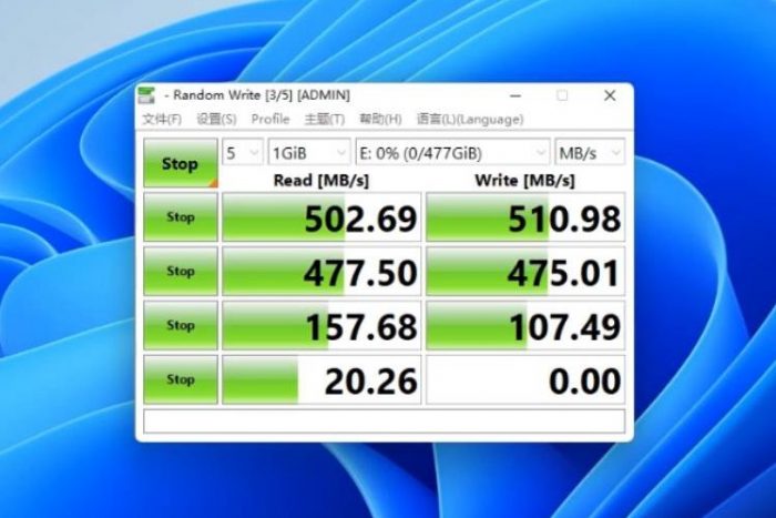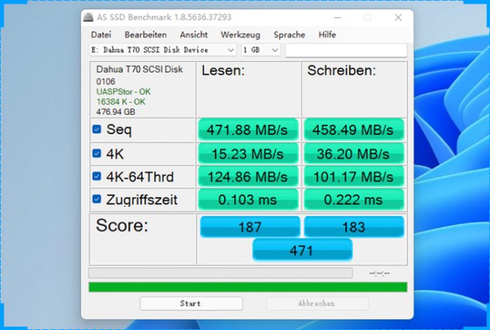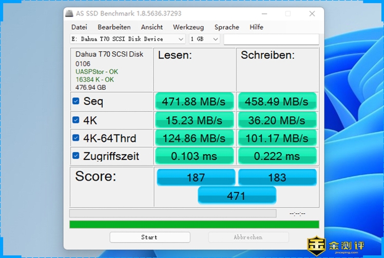 AS SSD跑分测试当中,它的读取速度为471.88MB/s,写入速度为458.49MB/s。这个成绩已经接近SATA SSD的上限了。
