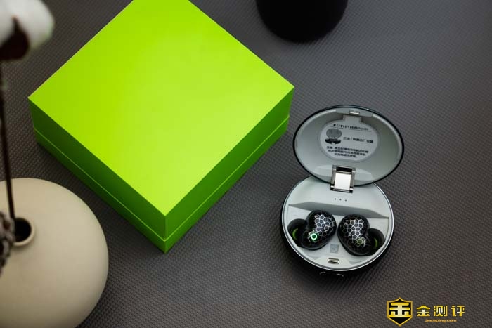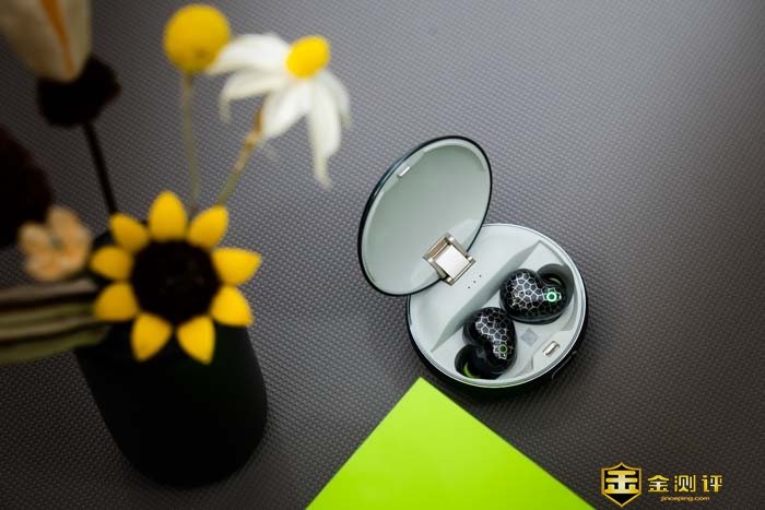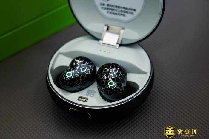 开盖后,可以看到我们的耳机主机就出现在眼前。这第一感觉就像是一颗蟒头。并且每只耳机还有一个绿色的LED灯圈代表工作状态。这灯圈就犹如蟒头的眼睛。把耳机做成这样,还真的是太有个性了。