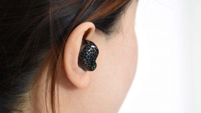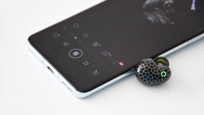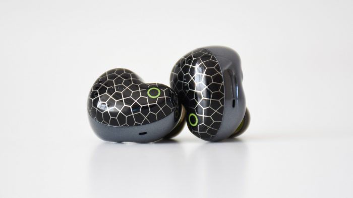耳机的造型也有些与众不同,音腔部分的体积比较大,有些类似于腰果的形态。耳机整体采用塑料材质的外壳,腔体外侧黑色打底,并设计有类似星空图案的五边形纹路装饰,靠近入耳部分的位置有环形指示灯,下方三颗凸起触点区域是触摸式按键,尾部还有三颗麦克风开孔。