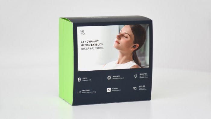 包装体积比较小巧,深蓝色和绿色撞色拼接,盒子正面印有耳机和收纳仓的渲染图,Logo和产品名称字样均采用烫银工艺印制。
