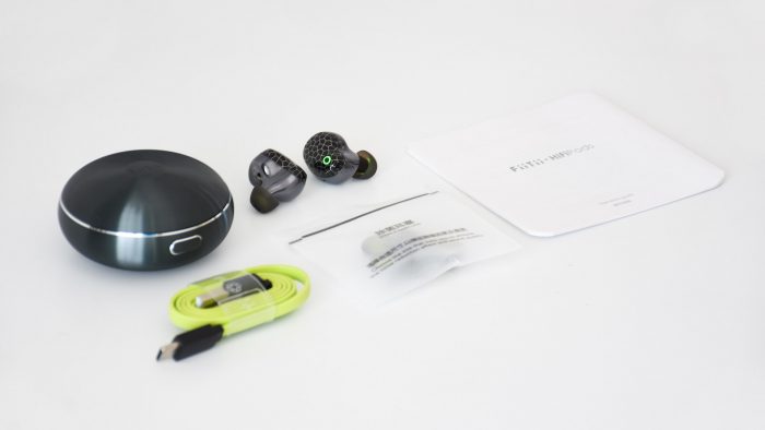 包装内容比较丰富,包含有HiFiPods耳机、充电收纳仓、Type C面条充电线、替换耳帽、使用说明书和防伪证书等纸质文件。
