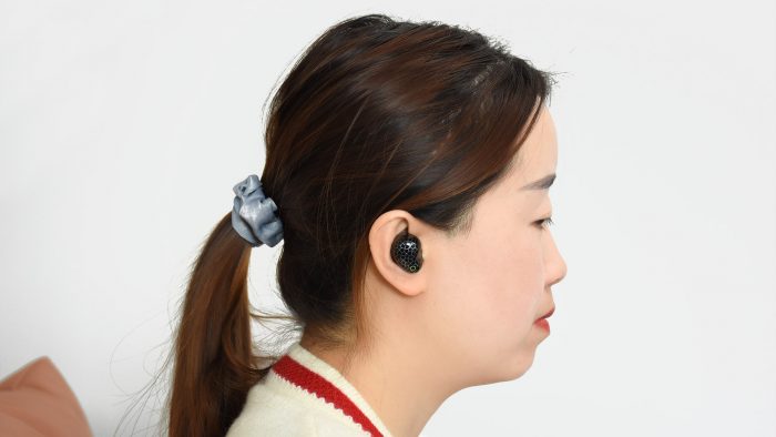虽然耳机整体的体积比较大,但好在重量控制还算不错,单只重量大约5.5克左右。正常佩戴状态下,倾斜的入耳部分顺势深入耳道,腔体内侧与耳屏相抵,佩戴舒适且比较牢固。对于耳道尺寸偏大或者偏小的用户,可以自行更换包装中附赠的替换耳帽,以达到舒适的佩戴体验。