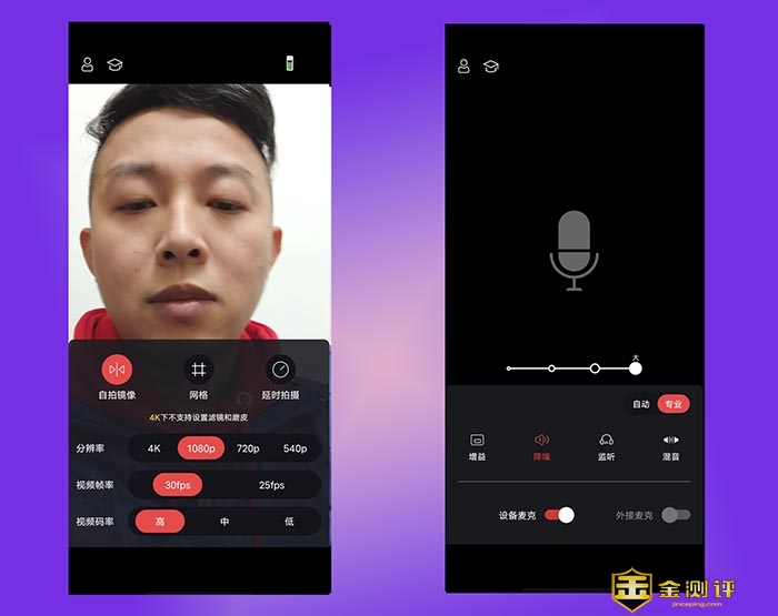 当然,在APP里,也可以进行视频或是录音的专业级调节。如切换视频的分辨率,帧率,码率,甚至是录音的增益,降噪,监听,混音等。还可以切换塞宾智麦的收音设备。如手机自带麦克风,或是接上带麦克风的耳机后也可以增加一个输入麦克风。