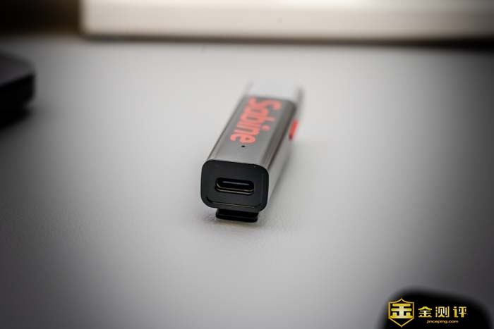 再来看正面,正面明显有一个3.5mm的耳机插孔,这个耳机插孔是用来实时监听用的。当然,当两个塞宾智麦配合在一起用的时候,一个做主机,另一个从副机。这时主机就是通过这个3.5mm的接口输出到手机或是相机等。