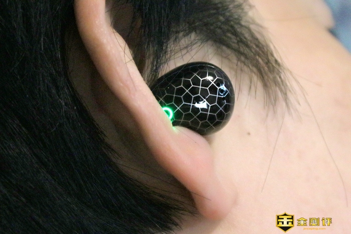 耳机外观非常时尚,深黑底色+蛛网纹路带来了张力十足的视觉效果,配合绿色的指示灯,整体看起来非常别致。