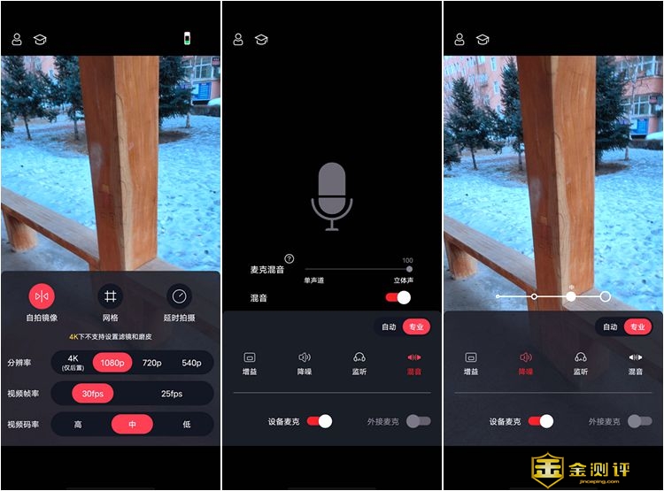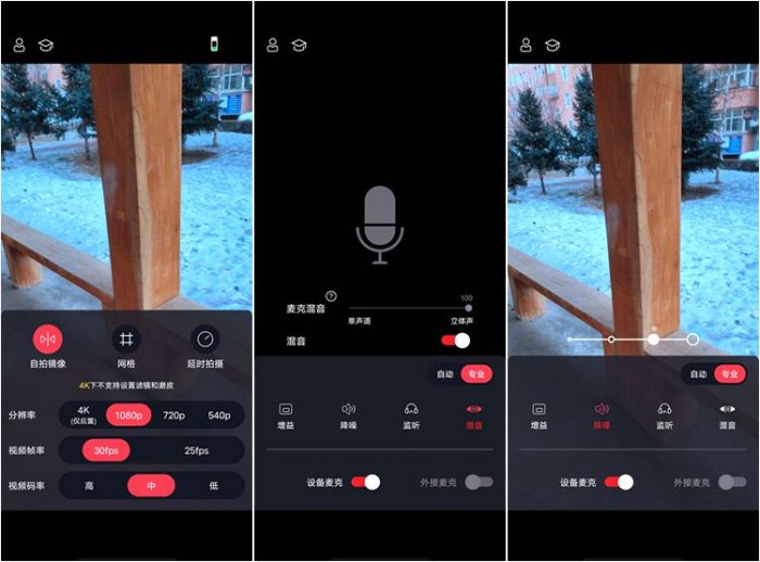 而音频设置显得更专业一些,选项中有4级降噪强度可调,此外还有音频增益和监听增益调整选项。混音模式下可与3.5mm耳机搭配使用,将背景音乐与人声融合,实现边录边听的功能,特别适合K歌时使用。
