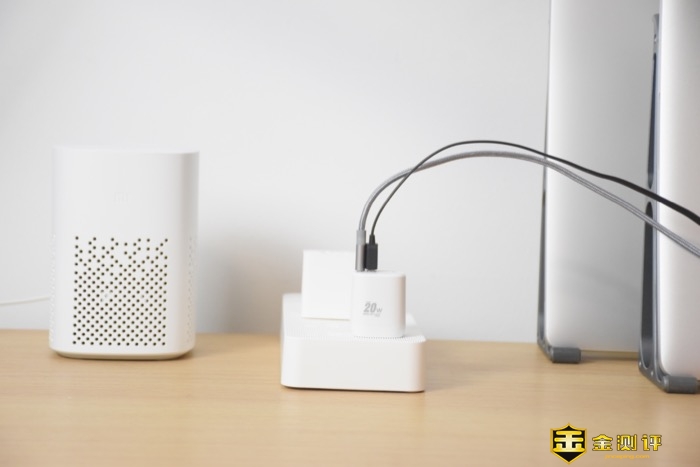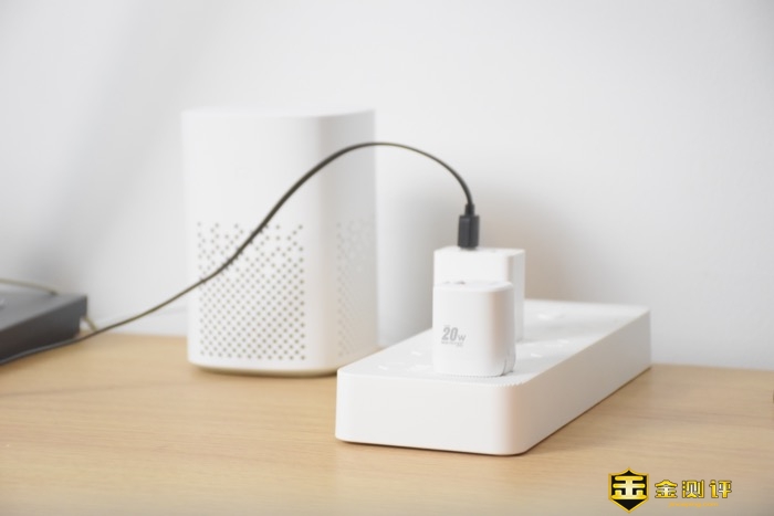 充电器顶部设计有一个Type-C充电口,支持最高20W快充输出,一个USB-A充电口,支持最高18W快充输出,2个口支持同时快充。充电口旁边设计有产品Logo。