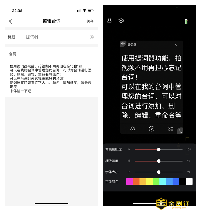 做短视频的朋友,或者做自媒体的朋友对提词器会有非常深的印象,在电视节目中嘉宾和主持人也会有提词器,做视频必备提词器。塞宾元音App提供提词器功能,并且提词器是悬浮在相机上,能够做到眼睛与摄像头的聚焦,并且提词器提供:背景透明度设置、播放速度、字体大小、字体颜色、提词器拖动、改变大小、自动滑动播放等功能。可以说一款提词器的功能,在塞宾元音App内得到了全功能的展现。