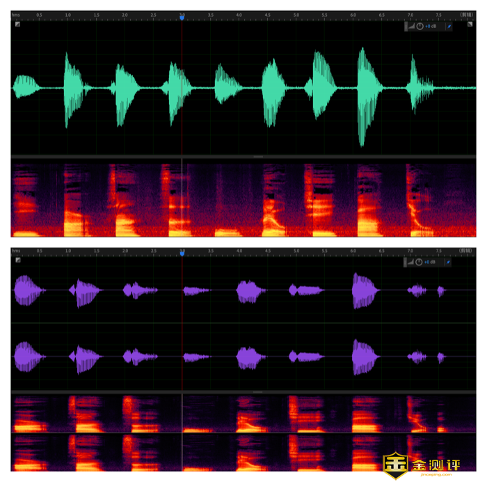 通过上图能够看出手机录制的音频波形更宽,波形顶部更尖,停顿位置前后会有杂音的波形。而塞宾智麦小搬1号开启4级降噪录制的音频波形更圆润,停顿前后没有杂音的波形,杂音并没有被录制进去,或者已经被降噪处理掉了。在实测中能够听出降噪前后明显的差异,家里暖风机的声音、靠近麦克风的喘息声、窗外川流的汽车声都能够经过降噪过滤掉。