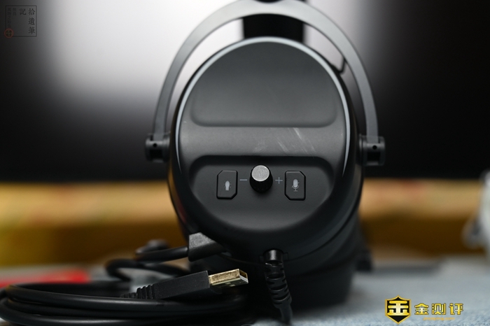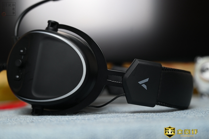 日常使用中,我们可以通过左耳外侧的控制键管理耳机,这里包括了灯效开关键、音量调节旋钮以及麦克风开关键,其中左右两枚按键带有LED灯效,效果更加好看,因为可以直接从耳机端调节音量,所以省去了我们切换设备时设置音量的麻烦。