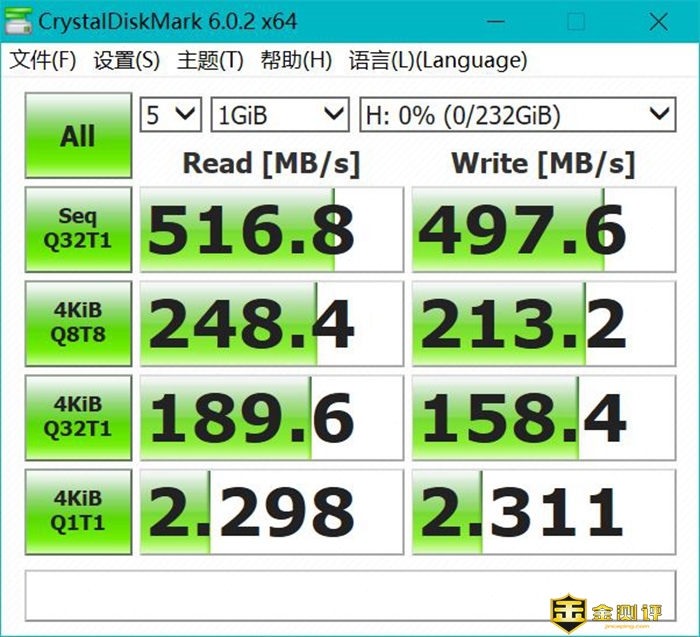 下面我们简单对大华S809进行一个读写测试,作为一款固态U盘,首先用CrystalDiskMark来进行读写测试,从结果可以看到大华S809的顺序读写速度能够达到516MB/s,顺序写入速度能够达到497MB/,完全符合官方标称的级别,这样的读写表现,不管是文件分享还是系统运行,都可以轻松搞定。
