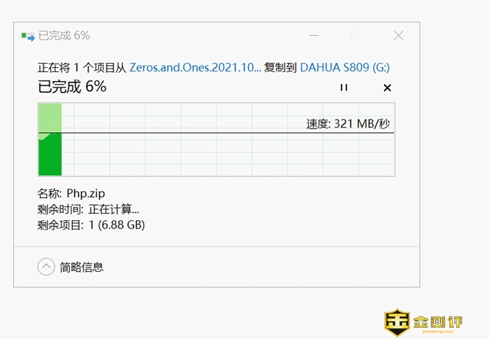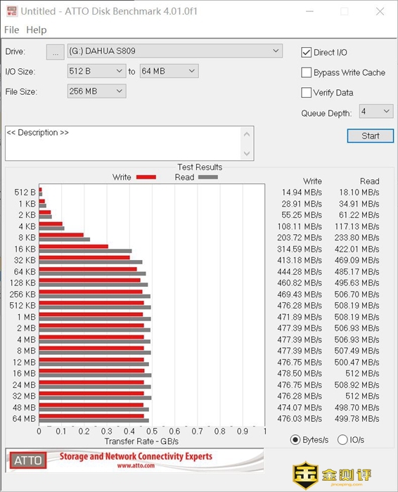 对于日常常用的小文件,通过ATTO进行测试,可以看到大华S809的读取速度能够稳定在508MB/s,写入速度则是可以达到477MB/s,同样是非常快的水准。平时备份文档、照片的时候都能很快搞定,实际传输文件的时候,能够稳定在27MB/s的写入速度。