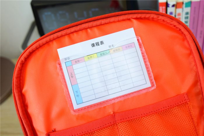 书包的内部采用了新型抗菌面料,对于大肠杆菌、金黄色葡萄球菌的抗菌率高达99%,可以有效抑制日常生活中常见的细。在书包内部上方还有个放置课程表的位置,可以方便孩子们了解每日课程安排。