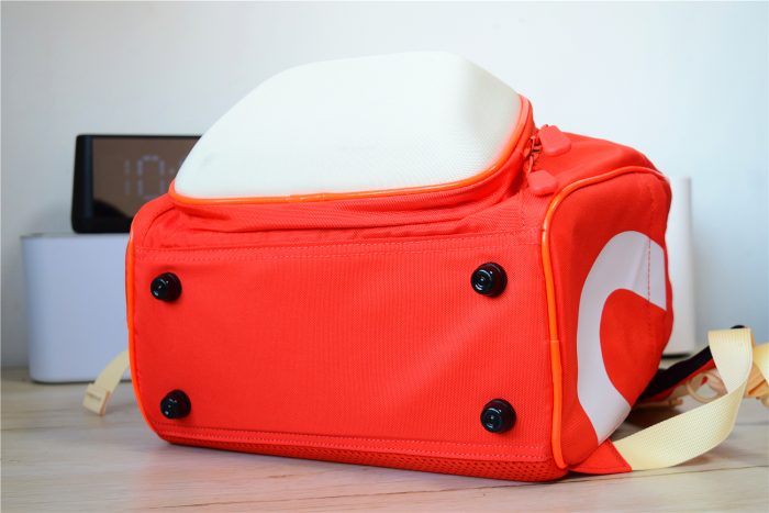 在书包的底部还设计了4个黑色的防滑脚钉,可以让书包底部不和地面直接接触,防止底部磨损,有效延长书包的使用寿命。