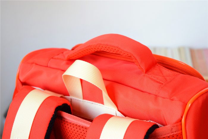 在书包的顶部有个提手,表面采用和书包外层相同的面料,下方填充记忆海绵,手提书包时不勒手;后方还有个简单的挂带,可以方便将书包挂起。