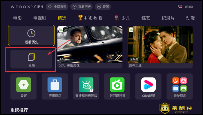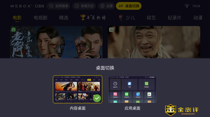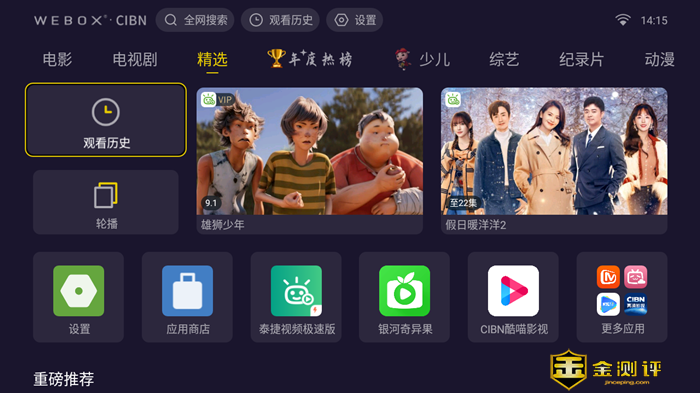 进入泰捷视频界面,整个界面的 UI设计十分简洁,模块采用简洁的方框式引导操作。首页上部 CIBN 标志表明了入网授权,同时设有搜索、观看历史和设置和时间等,往下是分类导航,中部为推荐视频,占位醒目。下部为应用快捷键以及推荐内容等,以磁贴形式规则分布,整体简洁有序。 电视盒子还可以自由切换 “内容桌面” 和 “应用桌面”,在应用桌面里我们可以看到系统自带的各种应用和自己下载的应用都在这里,非常的简洁。