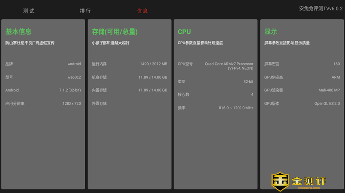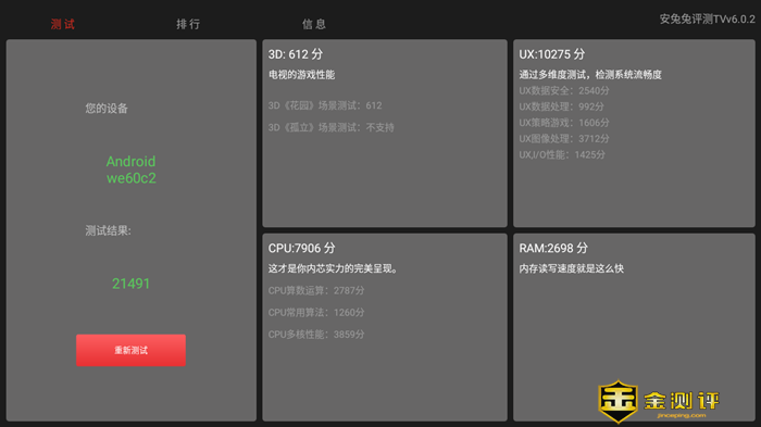 泰捷 WE60C 采用了瑞芯微芯片,2+16G 存储,运行速度更快,更大程度提升了视频播放的流畅度。使用安兔兔 TV 软件综合测试表跑分测试结果为 21491, 3D 性能、储存、CPU、显示分数都不错: