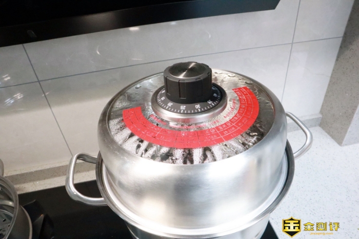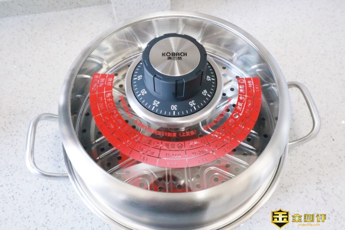 相信大家已经注意到了康巴赫防干烧智能定时蒸锅的锅盖上面似乎另有乾坤。确实,康巴赫防干烧智能定时蒸锅的锅盖把手是一个计时器,通过旋转计时器上劲后可以计时。这样我们就几乎可以避免忘记蒸东西或者更严重的干烧现象发生了。但是要注意使用方式,要先顺时针旋转上发条,然后再调到自己想要蒸的时间上,再然后耐心等等即可。到时间后计时器会发出类似小时候的闹铃的声音,做到了防干烧、不糊底、更安全。
