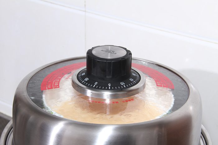 康巴赫防干烧定时蒸锅的锅盖与众不同的最大亮点就是在锅盖顶部中心加装了一个旋钮式机械定时器,采用类似钟表的发条原理,无需电池,使用前先顺时针旋转上满发条,再逆时针定位到需要的分钟处,即可实现定时闹铃提醒,从而达到防干烧目的。