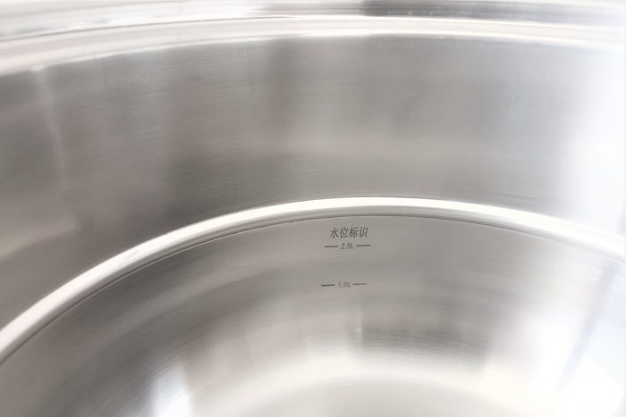 在锅内还标注了1.5L和2.5L两条水位线,可根据锅盖上菜谱提示科学加水,避免出现加水量过少的干烧和过多的热力浪费等情况。